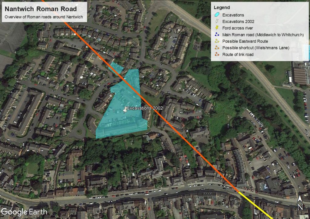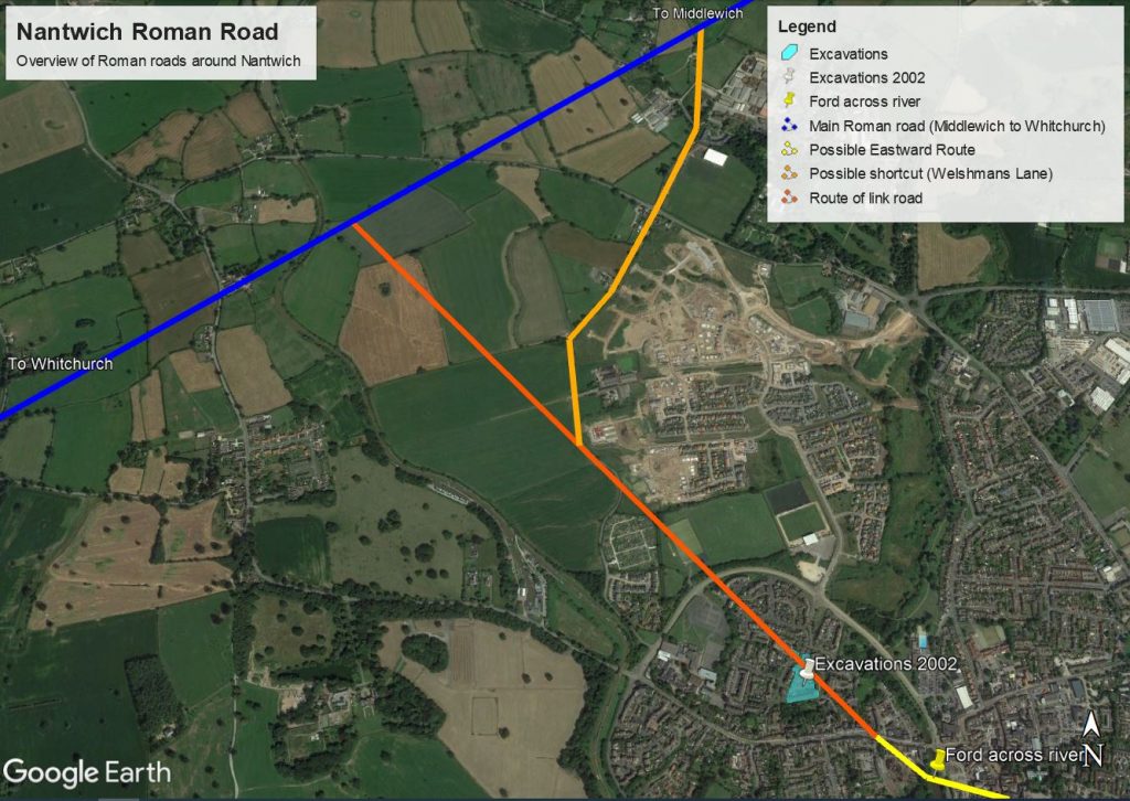 The blanks were filled in however when discovery was made of an ancient road running roughly SE to NW (Red on the map) in the North of the site linking Nantwich to the main Roman road (Blue on the map). Its rough path, strait of course in the Roman style, stretching from modern day Welsh Row probably somewhere between St Anne’s Lane and Red Lion Lane, through the modern housing estate, over the Waterlode bypass, through the Football pitch at Malbank School and for a short distance matching up with Welshmans Lane and finally across fields to meet the main road.