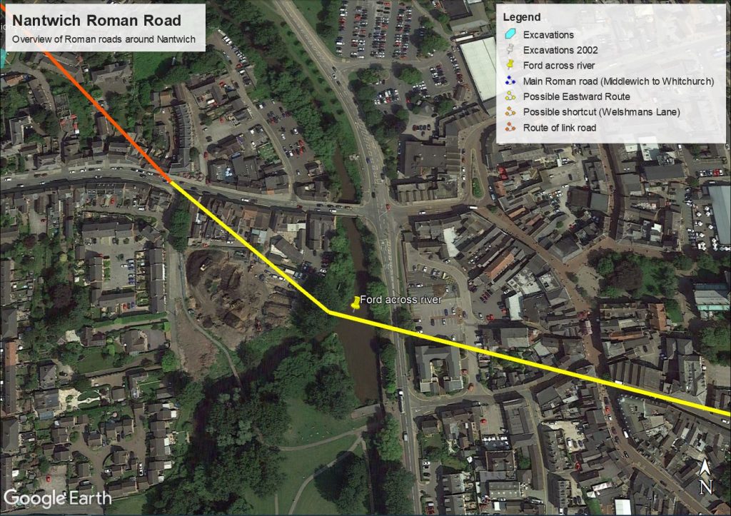 Researchers at Nantwich Museum have concluded that it is likely that the road continued in a similar direction South Easterly across what we know now as The Gas Works (soon to be redeveloped) to meet the river and a ford crossing to the North of Mill Island, giving access to the East side of the settlement, which was perhaps mainly residential in nature. From here the route of the road is unclear. The researchers think that the most likely route is out of town to the East forming what is now Hospital Street (Yellow on the map).